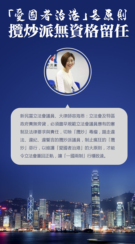 新民黨立法會議員容海恩在社交平台上載圖片,圖片題為「愛國者治港」是原則 攬炒派無資格留任。容海恩認為立法會和政府必須盡早規範立法會議員應有的憲制及法律要求與責任、踢走違法、違紀、違誓言的立法會議員及制止瘋狂的「攬炒」惡行,以維護「愛國者治港」的原則,令立法會重回正軌及讓「一國兩制」行穩致遠。(記者 唐信恒)