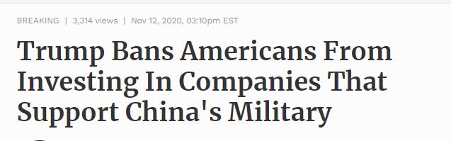 據福布斯新聞剛剛消息,特朗普政府於當地時間周四下午發布了一項行政命令,該命令禁止美國人及美國公司投資特朗普政府認定的與中國軍方有關的中國公司。報道稱該禁令還包括禁止美國投資者擁有或交易任何衍生自上述公司的證券。