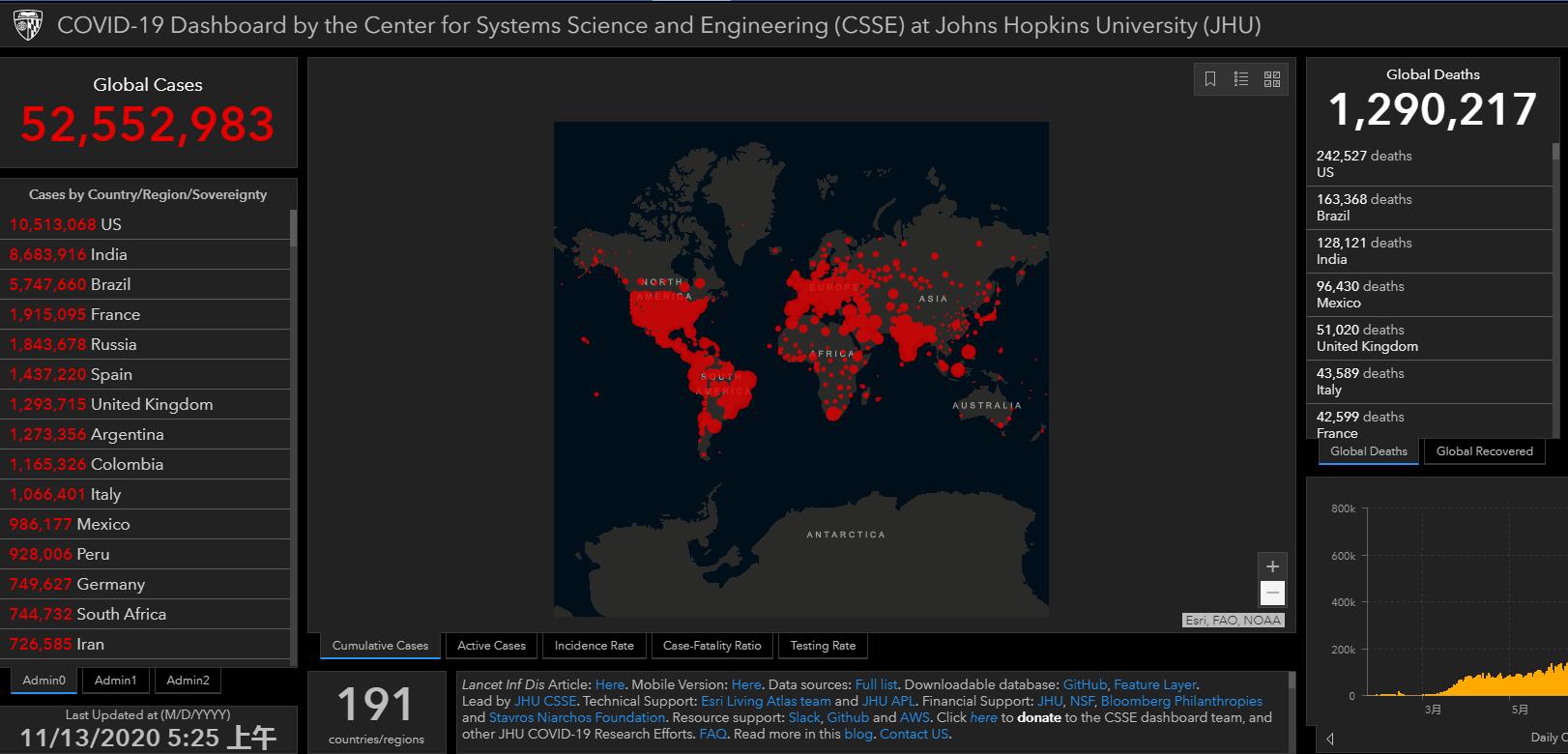 據美國約翰斯·霍普金斯大學統計數據顯示,截至香港時間13日5時30分左右,美國累計新冠肺炎確診病例超1050萬例,達到10513068例;死亡病例超24萬例,達到242527例。過去24小時,美國新增新冠肺炎確診病例151150例。