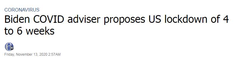 明尼苏达大学传染病研究和政策中心的主任、也是拜登的科学顾问Michael Osterholm博士周三表示,在疫苗可用之前,美国正走向黑暗的日子,必须在全国范围进行封锁4-6周,才能把新增病例和住院人数降至可控水平。他表示,我们可以现在就出台一揽子计划,支付所有工人的工资损失,包括中小企业或市、州、县政府的工资损失。这样我们才可以实施全国封锁。