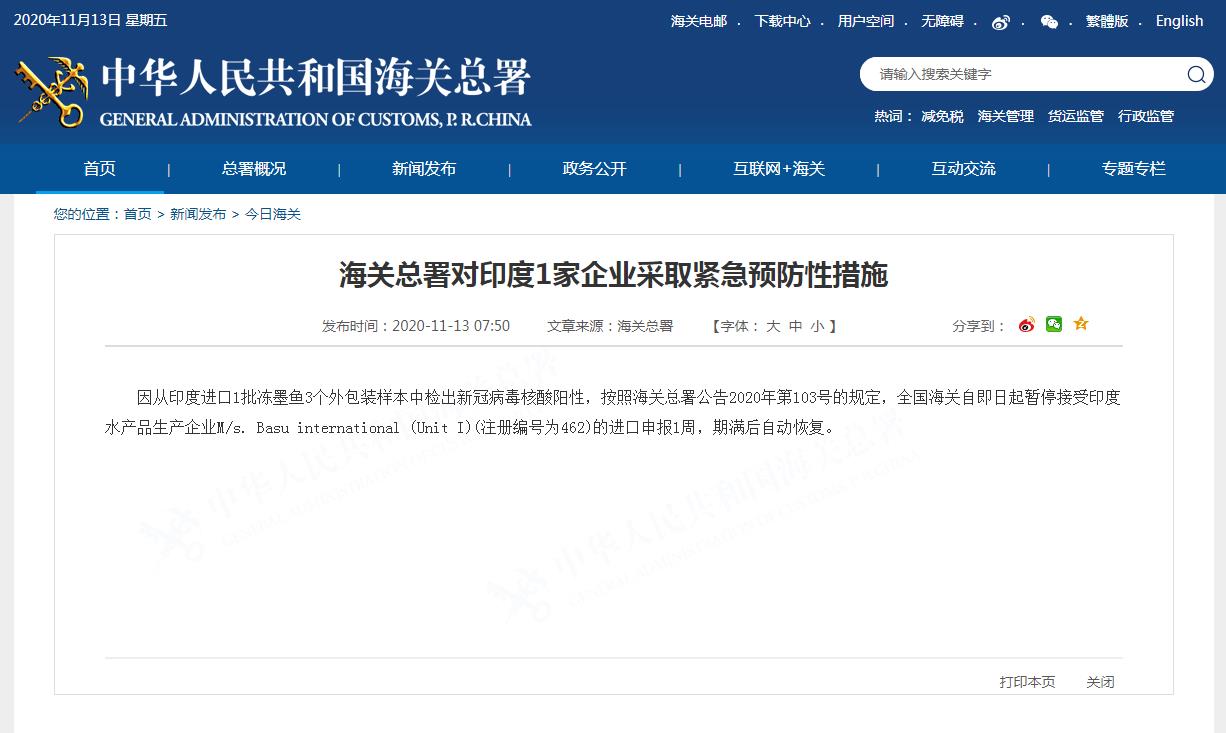 據海關總署網站11月13日消息,因從印度進口1批凍墨魚3個外包裝樣本中檢出新冠病毒核酸陽性,按照海關總署公告2020年第103號的規定,全國海關自即日起暫停接受印度水產品生產企業M/s. Basu international (Unit I)(註冊編號為462)的進口申報1周,期滿後自動恢復。