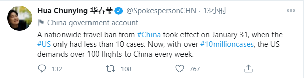 對此,外交部發言人華春瑩12日發推表示,「1月31日,美國的新冠病例數還少於10,一項針對中國的旅行禁令生效了。現在美國的病例已經超過了1000萬例,卻在要求每周往中國飛100多個航班。」