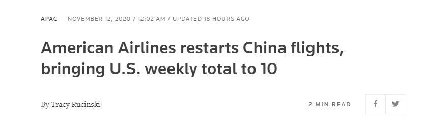 因新冠病毒導致航班中斷後,今年6月,中美同意兩國每周各恢復運營4個航班。8月,中美間每周航班增加到了各自8班,美聯航和達美航空各執飛4班。