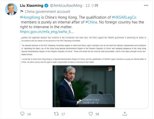 英國傳召中國駐英大使劉曉明,声称關注香港4名反對派立法會議員被取消資格一事。当地时间11月12日,劉曉明在社交網絡Twitter發文表示,香港特區政府的決定合情合理,全世界没有任何國家会允許分裂國家、顛覆政權、勾結外部勢力的人擔任議員等公職,違反法律而不承擔法律後果。