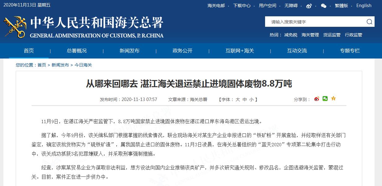 據了解,今年9月份,該關緝私部門根據掌握的線索情況,聯合現場海關對某生產企業申報進口的「鐵礦粉」開展查驗,並經取樣送有關部門鑑定,確定該批貨物實為「硫鐵礦渣」,屬我國禁止進口的固體廢物。11月3日淩晨,在海關總署組織的「藍天2020」專項第二輪集中打擊行動中,該關成功抓獲3名犯罪嫌疑人,並採取刑事強制措施。