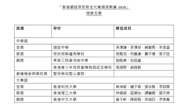 圖為「香港網絡保安新生代奪旗挑戰賽2020」的得獎名單