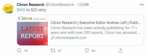 做空機構香櫞研究公司(Citron Research)13日發布消息稱,特斯拉Model Y電動汽車具有侵略性的定價,可能導致蔚來汽車(NYSE:NIO)股價跌至每股25美元。