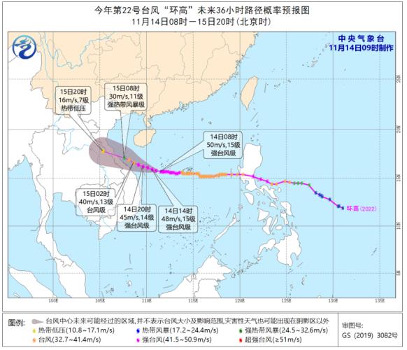 據央視新聞報道,海南省氣象局11月14日08時20分繼續發布颱風三級預警。據監測,今年第22號颱風「環高」已加強為強颱風,中心附近最大風力15級。預計14日將從海南島南部海面經過,15日白天在越南中北部一帶沿海登陸。受「環高」和冷空氣共同影響,14日至15日白天,海南省海域和陸地將有強風雨天氣,瓊州海峽航線客滾輪已於14日06時起全線停航。