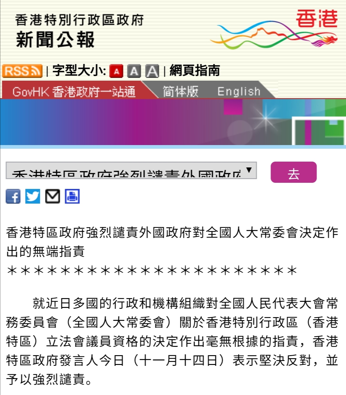 据香港特区政府网站11月14日消息,就近日多國的行政和機構組織對全國人大常委會關於香港特區立法會議員資格的決定作出毫無根據的指責,特區政府發言人14日表示堅決反對,並予以強烈譴責。