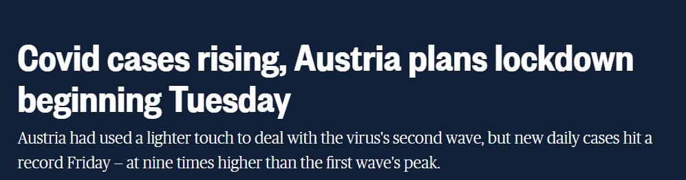 據外媒,奧地利總理塞巴斯蒂安·庫爾茨當地時間周六(14日)宣布,因疫情反彈,奧地利從11月17至12月6日實施全國封鎖。