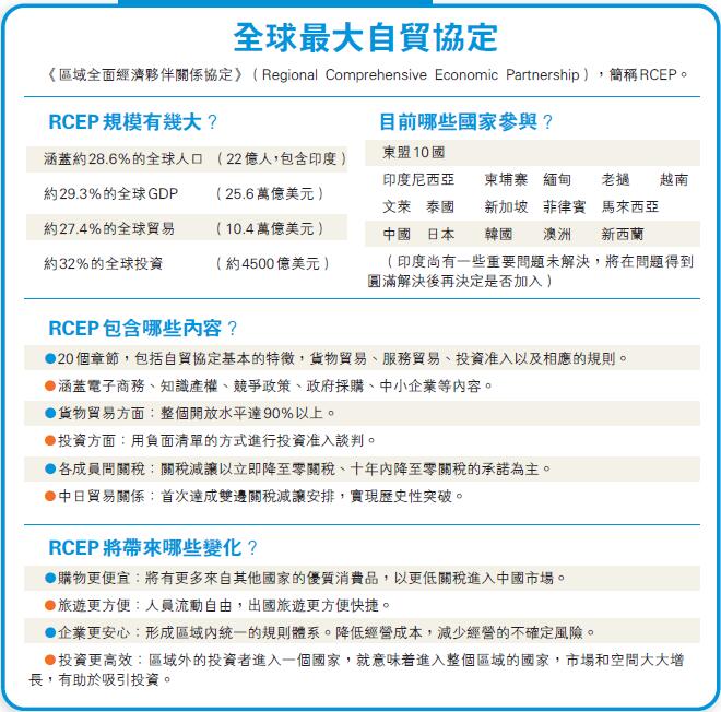 李克強昨早出席RCEP領導人會議時表示,我們15國領導人共同見證區域全面經濟夥伴關係協定(RCEP)的簽署,作為世界上參與人口最多、成員結構最多元、發展潛力最大的自貿區,這不僅僅是東亞區域合作極具標誌性意義的成果,更是多邊主義和自由貿易的勝利,必將為促進地區的發展繁榮增添新動能,為世界經濟實現恢復性增長貢獻新力量。