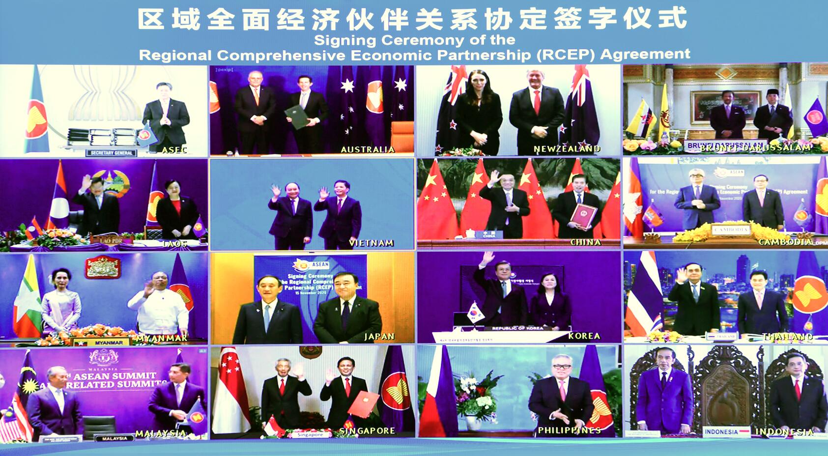 在當天在線簽署儀式上,東盟10國和澳洲、中國、日本、韓國、新西蘭5國經貿部長依次簽署該協定,15個成員國領導人見證了這一全球重大自貿協定的簽署。