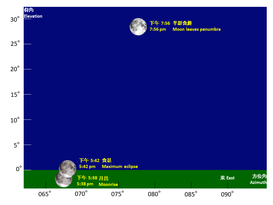 天文台指,月食會在30日下午3時30分開始,至下午7時56分結束,而食甚時間為月出後4分鐘的下午5時42分,而月食過程(由月出至半影食終)將歷時2小時18分鐘。