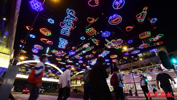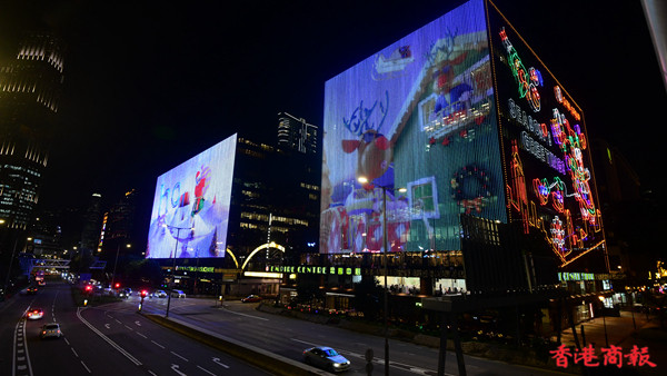 一年一度的聖誕燈飾開始亮燈。東尖沙咀地產發展商聯會今年舉辦「閃爍尖東耀香江」亮燈活動,區內及海濱長廊一帶多棟大廈的外牆燈飾昨晚同時亮起,包括尖沙咀中心及帝國中心,設由8.2萬顆變色LED圓點燈組成的多媒體幕牆燈飾,配以動感節拍躍動,變成「跳舞機」;南洋中心外牆亦掛上以「笑哈哈」公仔為主題的燈飾。(記者崔俊良攝)