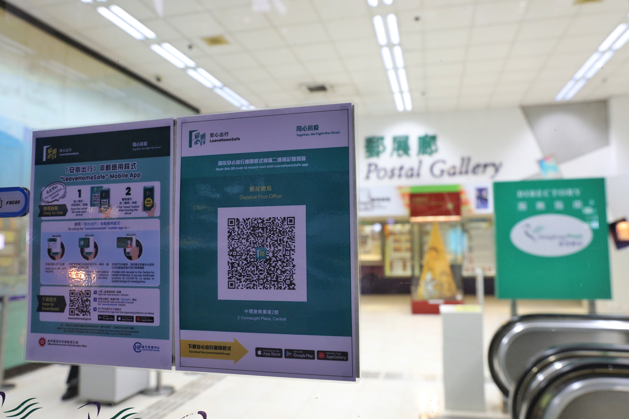 圖為中環郵政總局在顯眼處張貼有二維碼。(中通社)