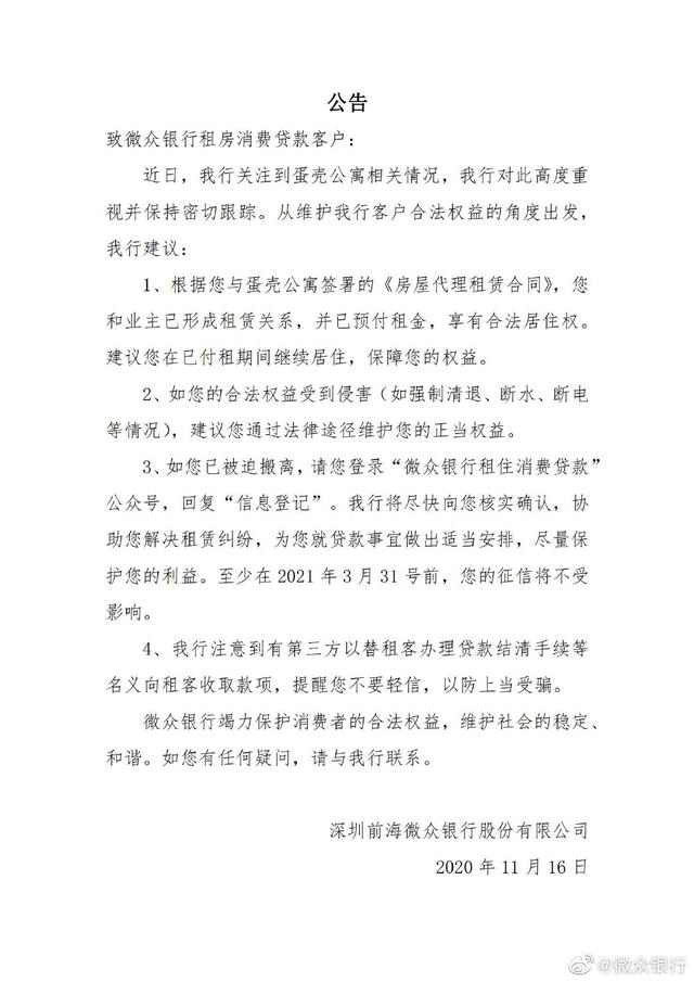 微眾銀行公告稱,從維護客戶合法權益的角度出發,該行建議,根據客戶與蛋殼公寓簽署的《房屋代理租賃合同》,並已預付租金,享有合法居住權。建議客戶在已付租期間繼續居住,保障合法權益。