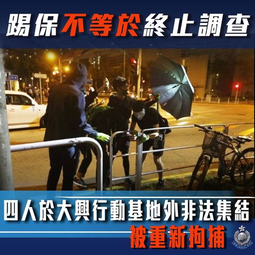 警方16日晚在社交平台表示,去年10月30日晚,大批暴徒在警察屯門大興行動基地外聚集,藉詞要求警方交代不明氣體來源,期間有人堵路。警方最終在當晚拘捕其中兩男兩女「非法集結」及「阻差辦公」,其後四人拒絕擔保。