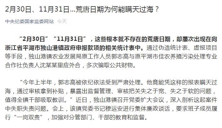 中央紀委國家監委網站今日刊文稱,「2月30日」「11月31日」,這些根本就不存在的荒唐日期,卻屢次出現在向浙江省平湖市獨山港鎮政府申報款項的相關統計表中。荒唐日期的背後,是不負責任的表現,是紀法意識的淡漠。