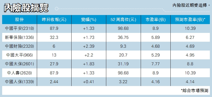 隨着內地疫情控制得力,經濟穩步復蘇,內險股經歷了疫情下的遏制階段後逐步回升。雖然內險股首九個月保費收入因疫情打擊而仍較疲弱,但市場大多看好行業明年初的復蘇前景,加上A股近期表現穩固,料利好內險股的投資收益。