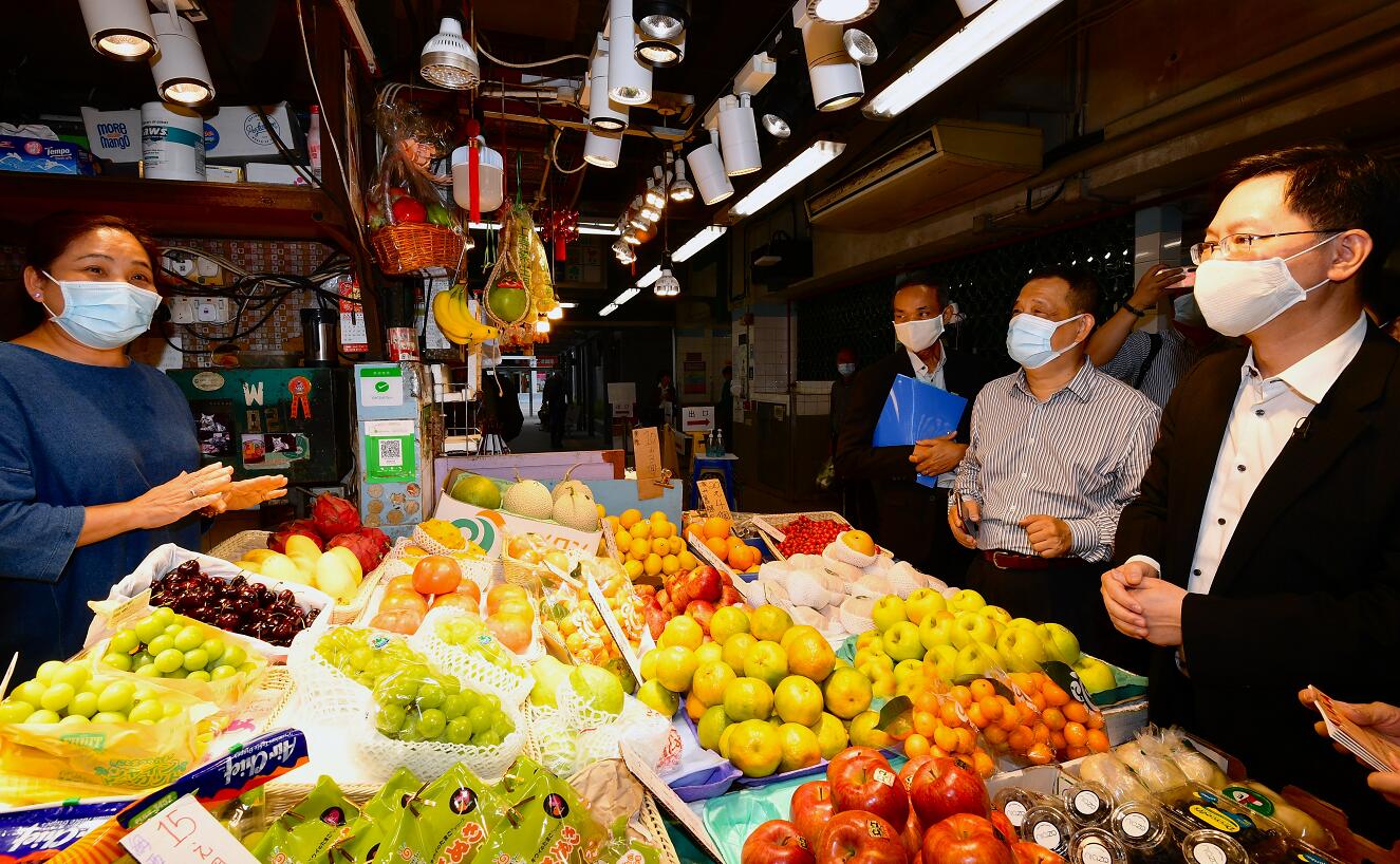 薛永恒在食環署副署長黃淑嫻陪同下,先到土瓜灣街市視察食環署街市加強科技抗疫和積極推廣「安心出行」的工作,他與在場的相關業界商會代表、攤檔租戶及街市顧客就防疫抗疫措施交流意見。