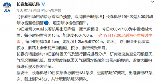 另據@長春龍嘉機場微博消息,長春機場今日(19日)淩晨3:00啟動除冰雪藍色預警,道面除冰橙色預警。據統計,長春機場截止到今日7:45分,共計取消航班55架次。