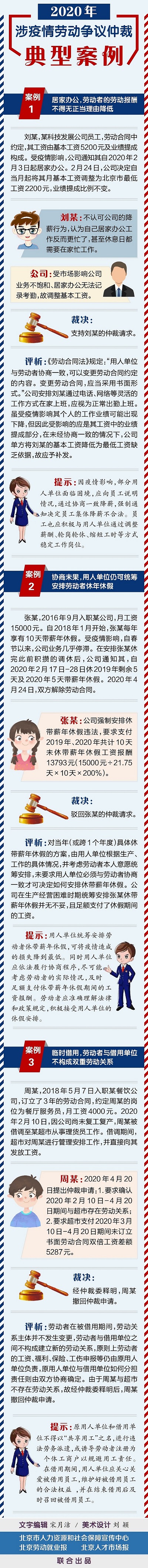 11月19日,北京市人社局發布2020年涉新冠肺炎疫情勞動爭議仲裁十大典型案例,涉及居家辦公、試用期延長、勞動合同續訂、带薪年休假、勞動合同解除等疫情防控期間較為常見的勞動爭議。對案件進行釋法分析和風險提示,有利於方便同類案件的參考和處置。