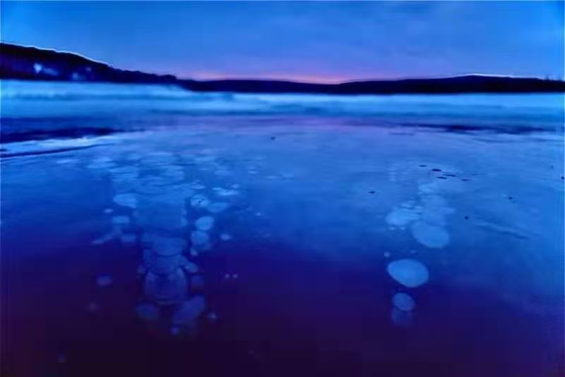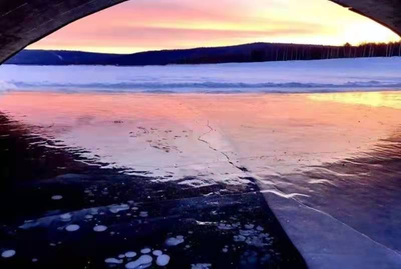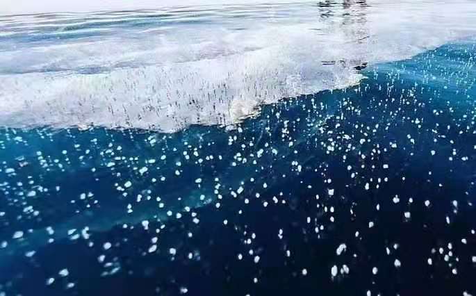 目前,漠河觀音山景區的蓮花湖湖面已完全封凍,冰層最厚的地方已超過60厘米,透過晶瑩剔透的冰面,可以看到一串串潔白的氣泡分布在冰層之中,形成惟妙惟肖的冰泡奇觀。這些冰泡晶瑩剔透、造型奇特,有的形似「飛碟」一飛沖天,有的形似「珊瑚」美輪美奐,形態各異......如一幅幅精美的冰雪藝術畫卷,吸引眾多攝影家和遊客慕名而來,成為漠河冬季火爆的打卡地點。