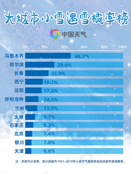 1951年至2019年的氣象大數據顯示,小雪節氣期間,烏魯木齊平均雪日為6.9天,遇雪概率近五成;哈爾濱、長春的雪日為3-4天,遇雪概率也有兩三成。