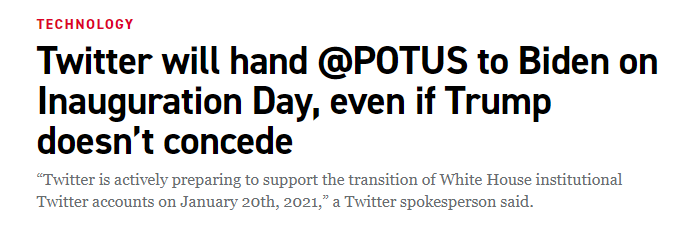 個人社交網站Twitter表示,會在明年1月20日美國總統就職日,將美國總統的Twitter官方帳號,移交民主黨拜登使用,其他白宮的官方帳號亦會在同日移交。