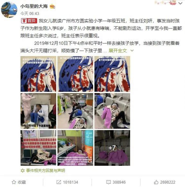 今年5月,一則「廣州市方圓實驗小學老師體罰哮喘學生至吐血搶救」的微博引發關注,其後出現反轉:血衣是該學生母親偽造。11月20日,廣東廣州白雲區人民法院對被告人劉某尋釁滋事案進行公開開庭審理並當庭宣判,以尋釁滋事罪判處劉某有期徒刑一年六個月,緩刑二年。