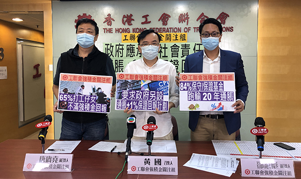 工聯會強積金關注組調查顯示,跑輸通脹是市民不滿強積金最大源頭,現存的較低風險強積金產品中84%跑輸過去20年通脹。就此,關注組倡議政府另設「通脹+ 1%」保證回報強積金計劃,為追求穩定回報的打工仔女提供多一個選擇。