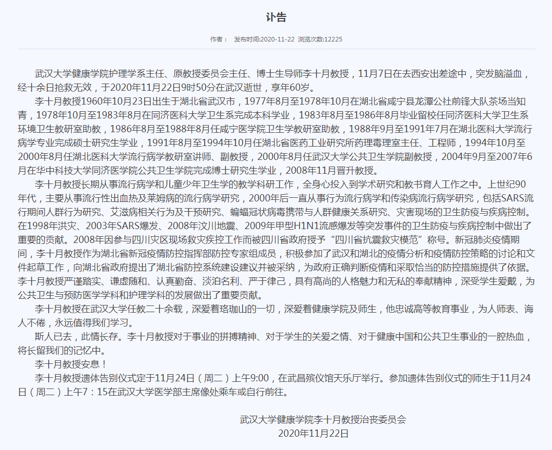 武漢大學健康學院護理學系主任、原教授委員會主任、博士生導師李十月教授,11月7日在去西安出差途中,突發腦溢血,經十餘日搶救無效,於2020年11月22日9時50分在武漢逝世,享年60歲。新冠肺炎疫情期間,李十月教授作為湖北省新冠疫情防控指揮部防控專家組成員,向湖北省政府提出了湖北省防控系統建設建議並被採納,為政府正確判斷疫情和採取恰當的防控措施提供了依據。