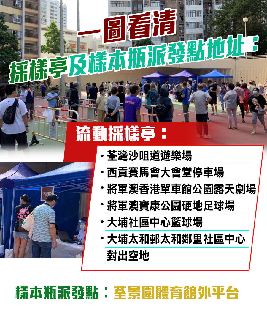 各採樣亭及樣本瓶派發點最早9時開始服務,將運作至星期五至日。