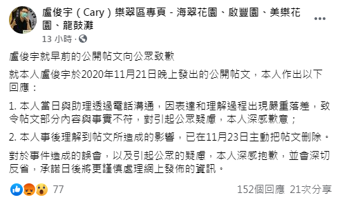 盧俊宇今日在社交專頁發文致歉,聲稱當日與助理透過電話溝通,因表達和理解過程出現嚴重落差,致令帖文部分內容與事實不符,對引起公眾疑慮,深感歉意。