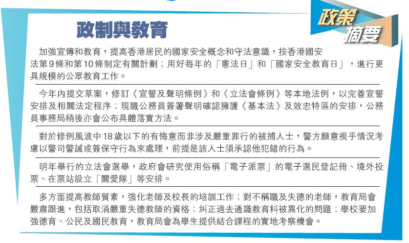 行政長官林鄭月娥在施政報告強調,要堅持「一國兩制」,不忘初心,必須依憲法和基本法辦事。報告提到,香港國安法為恢復香港穩定帶來顯著效果;要做到全面保障國家安全,特區政府有必要加強宣傳及教育,提高市民的國家安全概念和守法意識。特區政府會在今年內提交草案,修訂《宣誓及聲明條例》、《立法會條例》等法例,完善宣誓安排、相關法律程序。