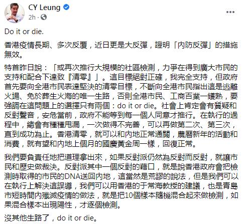 全國政協副主席梁振英26日在社交媒體發文,表示支持特首林鄭所說:「或再次推行大規模的社區檢測,力爭在得到廣大市民的支持和配合下達致『清零』」的目標。