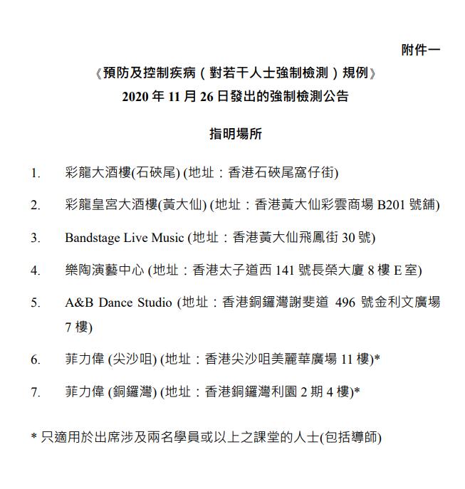 7個場所包括石硤尾彩龍大酒樓、彩雲商場彩龍皇宮大酒樓、黃大仙飛鳳街的Bandstage Live Music、太子道西樂陶演藝中心、銅鑼灣金利民廣場的A&B Dance Studio,以及菲力偉健美集團在尖沙咀美麗華商場及銅鑼灣利園的分店。