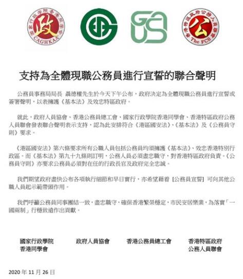香港公務員總工會、國家行政學院香港同學會、政府人員協會及香港特區政府公務人員協會發布聯合聲明,表示支持,認為該決定符合《香港國安法》、《基本法》及《公務員守則》要求。期望政府盡快公布各項執行細節及早日實行。