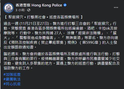 警方在社交平台表示,它們於21日至27日進行打擊三合會的行動,突擊搜查包括麻雀館、酒吧及按摩院等多間娛樂場所,而警方在行動中共拘捕 27人,亦向違反《預防及控制疾病(禁止羣組聚集)規例》(第599G章)的人士發出定額罰款通知書。