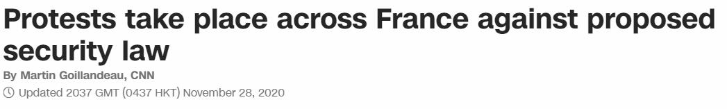 綜合多家外媒消息,當地時間28日,全法多個城市爆發大規模抗議活動,反對「整體安全法」。報道稱,這項法案將禁止人們拍攝正在執勤中的警察,否則將面臨一年監禁和數萬歐元的罰款。