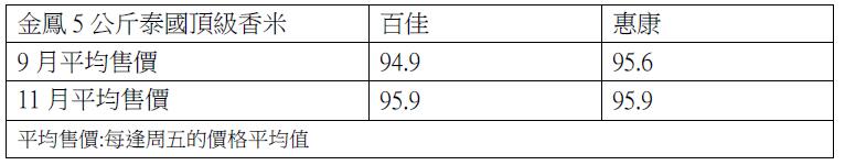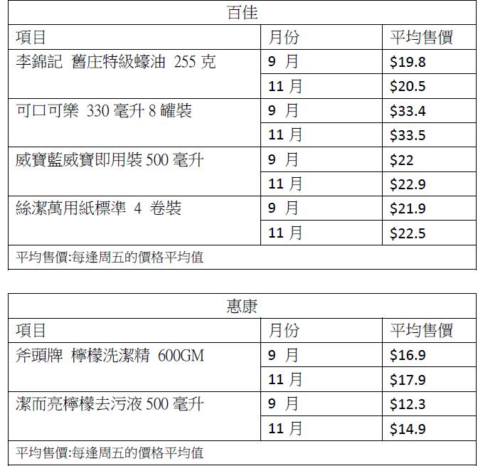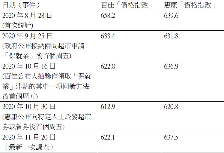 「超市價格關注組」指,它們由8月28日起以21項民生相關的貨品製訂「超市價格指數」。當時百佳的指數是658.2、而惠康是639.6;而關注組發現兩間超市的指數在3個月後的跌幅輕微,11月份惠康的價格指數是637.5,較8月份下跌0.32個百分點;而百佳的指數是622.1,跌幅不足3個百分點。