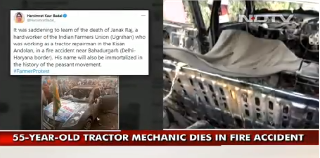 據新德里電視台29日報道,近日,為反對印度政府最近通過的中央農業法,成千上萬的農民在印度首都及其周邊地區紮營進行抗議。55歲的拖拉機修理工賈納克•拉吉(Janak Raj),來自旁遮普。他自願前往新德里參加農民抗議,為那裏紮營的抗議者們修理拖拉機。官員們稱,深夜,在巴哈杜爾加爾(德里-哈里亞納邦邊境)附近,拉吉完成工作後就在車裏睡著。但車輛突然著火,他被活活燒死。