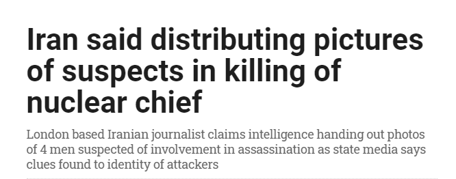 據《以色列時報》報道,一名身在倫敦的伊朗記者29日晚表示,伊朗已分發了四名嫌疑人在殺害高級核科學家莫森·法赫里紮德(Mohsen Fakhrizadeh)中的照片。