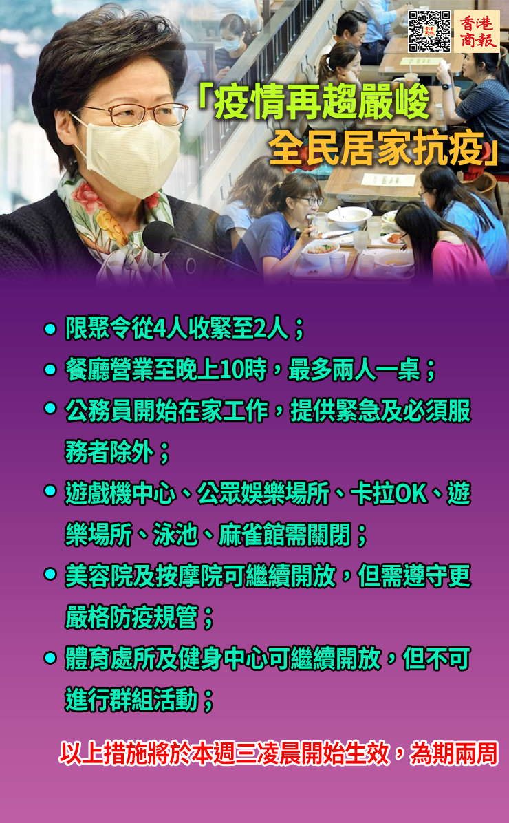 林鄭表示,今日新增76宗確診個案,當中9宗為源頭不明個案,認為疫情有惡化跡象,故今日宣布要再進一步收緊社交距離措施。新措施當中包括除緊急服務外,公務員在家辦公,亦呼籲私人機構亦盡量安排員工在家工作;而卡拉OK、麻雀館、遊戲機中心、泳池等將會關閉,健身中心及體育館則會繼續開放,最多只可2人一組活動。餐廳食肆堂食方面亦可繼續營業,但營業時間只可到晚上10時,並且由4人減至2人一枱;限聚令亦由4人減至2人。而若違反限聚令、口罩令、強制檢測令的罰款亦將會以倍數提高,待行政會議通過;同時將設立熱線供市民舉報防疫違規行為。