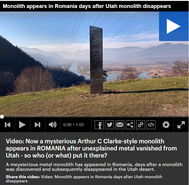 此前,在美國猶他州沙漠中也曾出現神秘金屬巨石,該巨石與羅馬尼亞發現的巨石設計相似,高達3.6米,置於沙漠紅色岩石林之中。不過,這座巨石在11月27日突然消失。