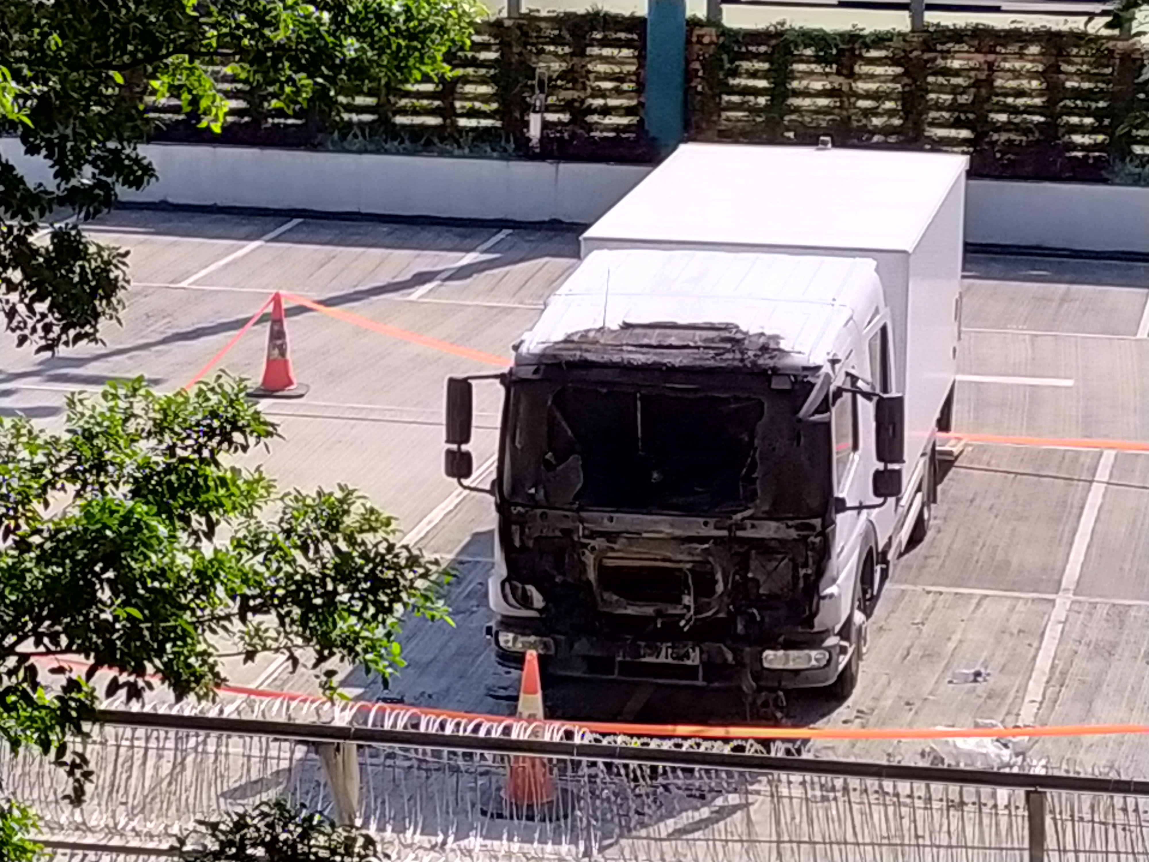 現場所見,警察體育遊樂會正門位置仍有水馬圍封,進入人士須要檢查。事發停車場離正門有一段距離,朝向大坑東一處山坡,外圍有鐵絲網圍封及掛上綠色帆布,地面位置無法看見停車場內情況,要登上山坡才可看見。昨晨起火的輕型貨車仍停泊在內,警員拉起膠帶圍封,探員到場拍照及蒐證。