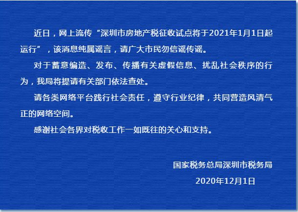 12月1日,深圳稅務局微信公眾號發布消息稱,近日,網上流傳「深圳市房地產稅徵收試點將於2021年1月1日起運行」,該消息純屬謠言,請廣大市民勿信謠傳謠。
