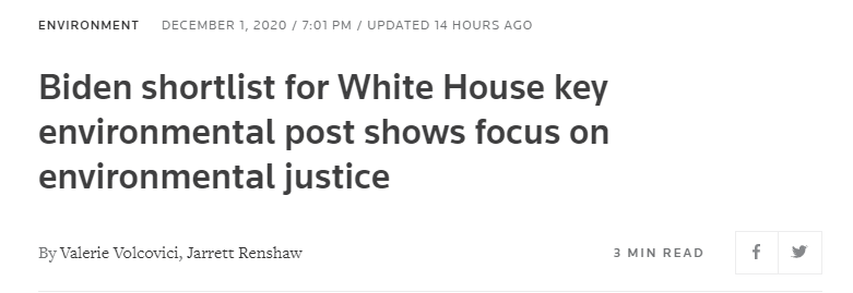 美國「當選總統」拜登還在緊鑼密鼓地籌組「過渡班子」。據路透社最新報道,拜登正考慮由環境正義運動領袖執掌白宮環境質量委員會,目前有3名人選。除此之外,拜登團隊本周已開始就美國環保署署長最終3名人選進行最後評估。