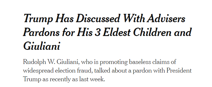 据多家美媒1日報道稱,特朗普多位同僚正在向特朗普呼籲,希望能在其離任前獲得赦免。報道指出,特朗普已經與顧問討論,是否要「提前」給自己的三個孩子、女婿以及私人律師提供總統特赦。