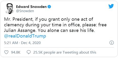 據美國《國會山報》3日報道,「稜鏡門」事件「吹哨人」斯諾登當日在推特上喊話特朗普,希望他能赦免維基解密創始人阿桑奇。斯諾登寫道:「總統先生,如果您在任期內只允許寬恕一件事,請赦免朱利安·阿桑奇。只有你才能挽救他的生命。」